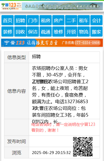 2大曹庄农场公司招聘普工2名,女,能上夜班,吃苦耐劳,有责任心,食宿免费,额满为止。电话13273685370