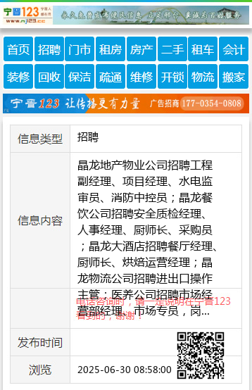 晶龙地产物业公司招聘工程副经理、项目经理、水电监审员、消防中控员;晶龙餐饮公司招聘安全质检经理、人事经理、厨师长、采购员;晶龙大酒店招聘餐厅经理、厨师长、烘焙运营经理;晶龙物流公司招聘进出口操作主管;医养公司招聘市场经营部经理、市场专员,岗位多多,有意者电话联系:03195856130 【电话咨询时,请一定说明在宁晋123看到的,谢谢!】 |