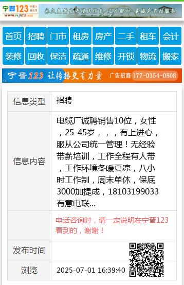电缆厂诚聘销售10位,女性,25-45岁,,,有上进心,服从公司统一管理!无经验带薪培训,工作全程有人带,工作环境冬暖夏凉,八小时工作制,周末单休,保底3000加提成,18103199033有意电联 【电话咨询时,请一定说明在宁晋123看到的,谢谢!】 |