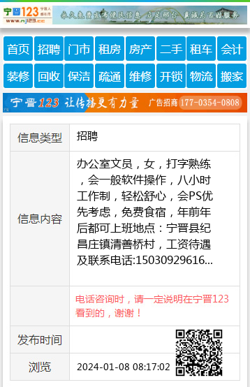 办公室文员,女,打字熟练,会一般软件操作,八小时工作制,轻松舒心,会PS优先考虑,免费食宿,年前年后都可上班地点:宁晋县纪昌庄镇清善桥村,工资待遇及联系电话:15030929616 【电话咨询时,请一定说明在宁晋123看到的,谢谢!】 |