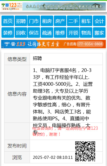 1、电脑打字客服4名,20-33岁,有工作经验半年以上.工资4000-5000元。2、运营助理3名,大专及以上学历专业跟电商有关的优先、数字敏感性高,细心,有晋升体制。3、网店美工3名,能熟练使用PS。4、直播间中控文员,电脑操作熟练,大专毕业。以上岗位都有全勤公休饭补。联系 13303194319 宁高路电视台西行 【电话咨询时,请一定说明在宁晋123看到的,谢谢!】 |