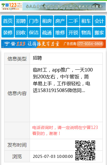 宁晋123(www.nj123.cc)提醒您:手工活、网络兼职、刷单,都是骗子!凡以各种名义收取费用的都是骗子!找工作是往兜里挣钱,让你往外掏钱的都是骗子!异地招聘请提高警惕,谨防诈骗!