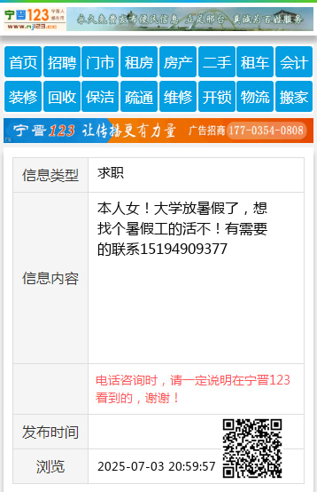 本人女!大学放暑假了,想找个暑假工的活不!有需要的联系15194909377