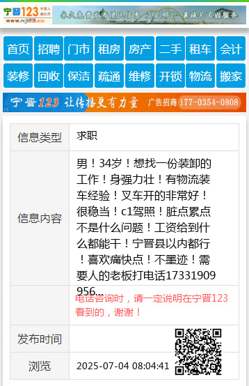 男!34岁!想找一份装卸的工作!身强力壮!有物流装车经验!叉车开的非常好!很稳当!c1驾照!脏点累点不是什么问题!工资给到什么都能干!宁晋县以内都行!喜欢痛快点!不墨迹!需要人的老板打电话17331909956 【电话咨询时,请一定说明在宁晋123看到的,谢谢!】 |