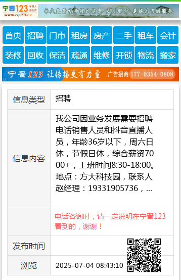 我公司因业务发展需要招聘电话销售人员和抖音直播人员,年龄36岁以下,周六日休,节假日休,综合薪资7000+,上班时间8:30-18:00。地点:方大科技园,联系人赵经理:19331905736, 【电话咨询时,请一定说明在宁晋123看到的,谢谢!】 |