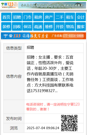 招聘:女主播,要求:五官端正,性格活泼外向,爱说话,年龄20-30岁,主要工作内容就是直播互动(无销售任务)工资面谈,工作地点:方大科技园有意联系电话17531998327 【电话咨询时,请一定说明在宁晋123看到的,谢谢!】 |