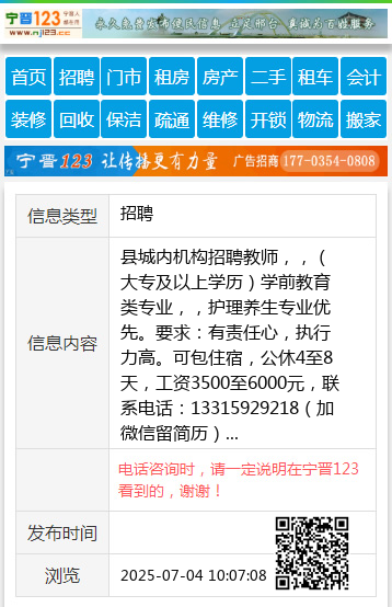 县城内机构招聘教师,,(大专及以上学历)学前教育类专业,,护理养生专业优先。要求:有责任心,执行力高。可包住宿,公休4至8天,工资3500至6000元,联系电话:13315929218(加微信留简历) 【电话咨询时,请一定说明在宁晋123看到的,谢谢!】 |