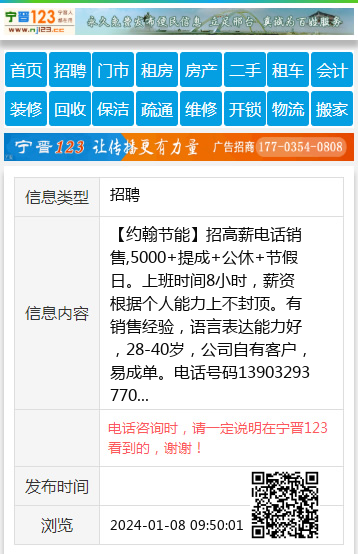 【约翰节能】招高薪电话销售,5000+提成+公休+节假日。上班时间8小时,薪资根据个人能力上不封顶。有销售经验,语言表达能力好,28-40岁,公司自有客户,易成单。电话号码13903293770 【电话咨询时,请一定说明在宁晋123看到的,谢谢!】 |
