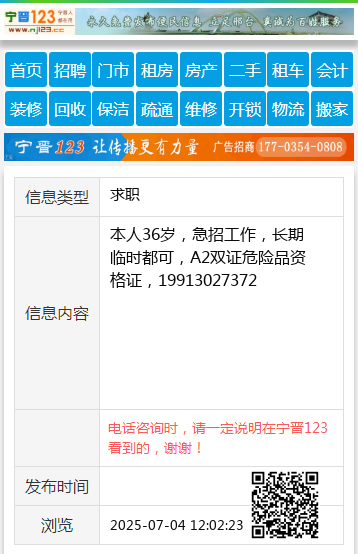 本人36岁,急招工作,长期临时都可,A2双证危险品资格证,19913027372
