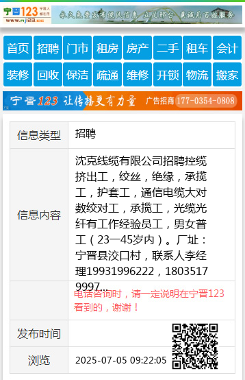 沈克线缆有限公司招聘控缆挤出工,绞丝,绝缘,承揽工,护套工,通信电缆大对数绞对工,承揽工,光缆光纤有工作经验员工,男女普工(23一45岁内)。厂址:宁晋县洨口村,联系人李经理19931996222,18035179997 【电话咨询时,请一定说明在宁晋123看到的,谢谢!】 |
