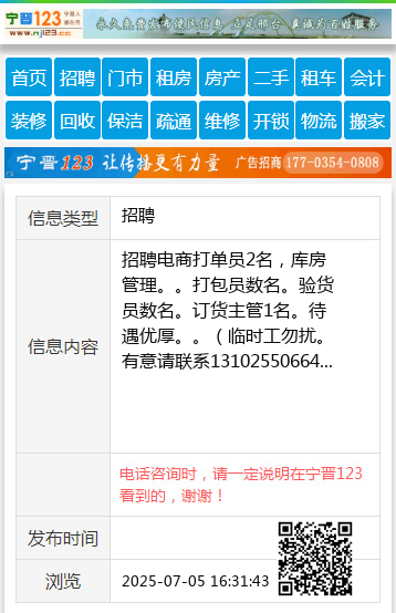 招聘电商打单员2名,库房管理。。打包员数名。验货员数名。订货主管1名。待遇优厚。。(临时工勿扰。有意请联系13102550664 【电话咨询时,请一定说明在宁晋123看到的,谢谢!】 |