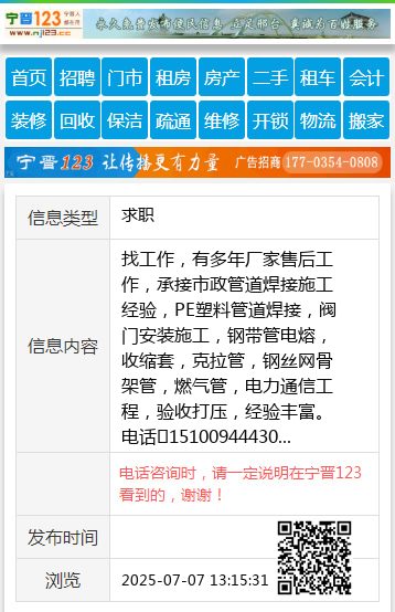 找工作,有多年厂家售后工作,承接市政管道焊接施工经验,PE塑料管道焊接,阀门安装施工,钢带管电熔,收缩套,克拉管,钢丝网骨架管,燃气管,电力通信工程,验收打压,经验丰富。电话15100944430 【电话咨询时,请一定说明在宁晋123看到的,谢谢!】 |