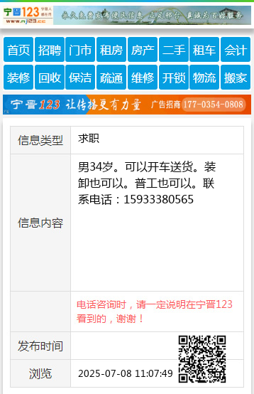 男34岁。可以开车送货。装卸也可以。普工也可以。联系电话:15933380565