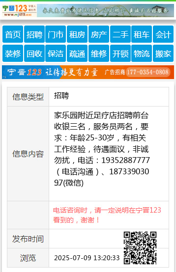 家乐园附近足疗店招聘前台收银三名,服务员两名,要求:年龄25-30岁,有相关工作经验,待遇面议,非诚勿扰,电话:19352887777(电话沟通)、18733903097(微信)