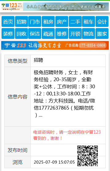 极兔招聘财务,女士,有财务经验,20-35周岁,全勤奖+公休,工作时间:8:30-12:00,13:30-18:00.工作地址:方大科技园。电话/微信17772637865(短期勿扰)