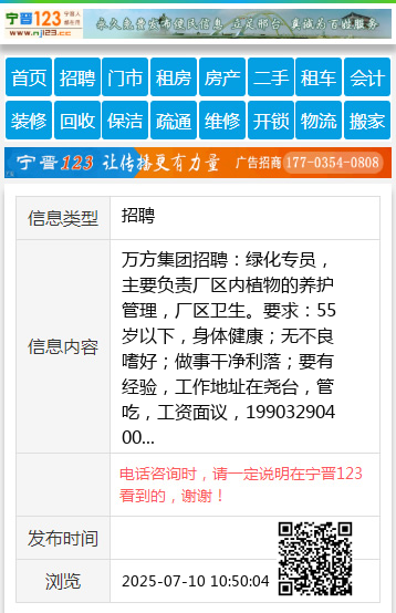 万方集团招聘:绿化专员,主要负责厂区内植物的养护管理,厂区卫生。要求:55岁以下,身体健康;无不良嗜好;做事干净利落;要有经验,工作地址在尧台,管吃,工资面议,19903290400 【电话咨询时,请一定说明在宁晋123看到的,谢谢!】 |