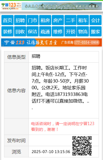 招聘。饭店长期工。工作时间上午8点-12点。下午2点-7点。年龄30-50岁。月薪3000。公休2天。地址家乐园附近。电话18731933863电话打不通可以直接加微信。 【电话咨询时,请一定说明在宁晋123看到的,谢谢!】 |