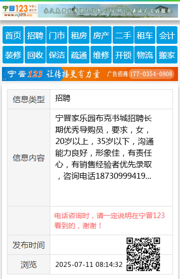 宁晋家乐园布克书城招聘长期优秀导购员,要求,女,20岁以上,35岁以下,沟通能力良好,形象佳,有责任心,有销售经验者优先录取,咨询电话18730999419 【电话咨询时,请一定说明在宁晋123看到的,谢谢!】 |
