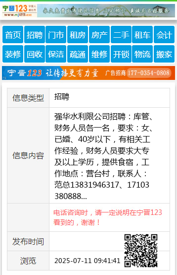 强华水利限公司招聘:库管、财务人员各一名,要求:女、已婚、40岁以下,有相关工作经验,财务人员要求大专及以上学历,提供食宿,工作地点:营台村,联系人:范总13831946317、17103380888 【电话咨询时,请一定说明在宁晋123看到的,谢谢!】 |