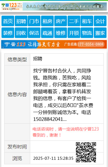 找宁晋各村合伙人,共同挣钱。路我跑,苦我吃,风险我承担,你只需在家翘着二郎腿喝着茶,拿着手机转发我的信息,有客户了给我一电话,成交以后💰茶水费一分钟到账诚信为本。电话15028842041 【电话咨询时,请一定说明在宁晋123看到的,谢谢!】 |