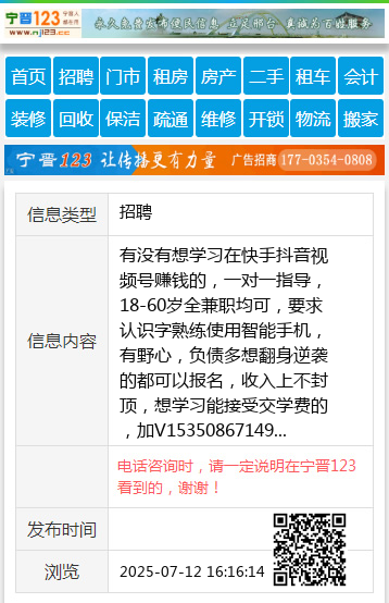 有没有想学习在快手抖音视频号赚钱的,一对一指导,18-60岁全兼职均可,要求认识字熟练使用智能手机,有野心,负债多想翻身逆袭的都可以报名,收入上不封顶,想学习能接受交学费的,加V15350867149 【电话咨询时,请一定说明在宁晋123看到的,谢谢!】 |