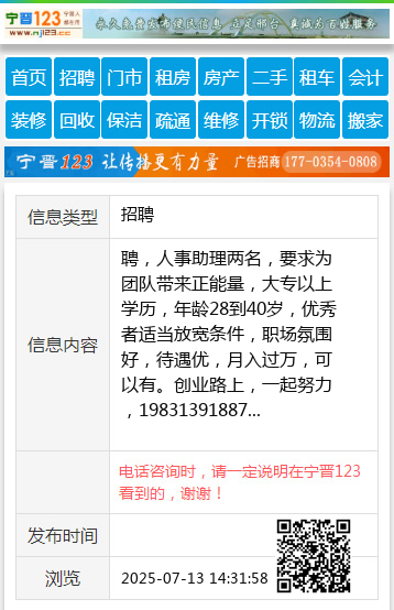 聘,人事助理两名,要求为团队带来正能量,大专以上学历,年龄28到40岁,优秀者适当放宽条件,职场氛围好,待遇优,月入过万,可以有。创业路上,一起努力,19831391887 【电话咨询时,请一定说明在宁晋123看到的,谢谢!】 |