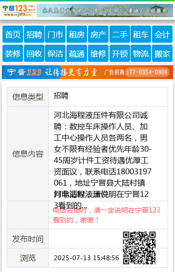 河北海程液压件有限公司诚聘:数控车床操作人员、加工中心操作人员各两名,男女不限有经验者优先年龄30-45周岁计件工资待遇优厚工资面议,联系电话18003197061,地址宁晋县大陆村镇河北海程液压件 打电话时,请说明在宁晋123看到的,谢谢!