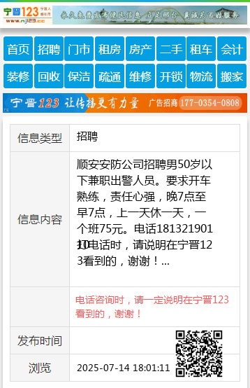 顺安安防公司招聘男50岁以下兼职出警人员。要求开车熟练,责任心强,晚7点至早7点,上一天休一天,一个班75元。电话18132190110