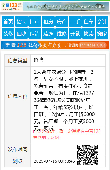 2大曹庄农场公司招聘普工2名,男女不限,能上夜班,吃苦耐劳,有责任心,食宿免费,额满为止。电话132736853701