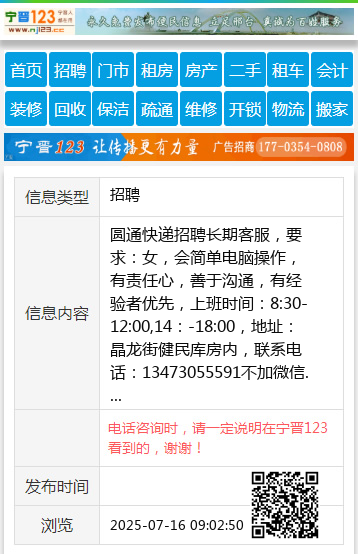圆通快递招聘长期客服,要求:女,会简单电脑操作,有责任心,善于沟通,有经验者优先,上班时间:8:30-12:00,14:-18:00,地址:晶龙街健民库房内,联系电话:13473055591不加微信. 【电话咨询时,请一定说明在宁晋123看到的,谢谢!】 |