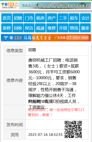 唐邱机械工厂招聘:电话销售3名,(女士)薪资=底薪3600元,月平均工资薪6000元--10000元,要求,销售经验2年以上,20周岁--38周岁,性格开朗善于沟通,理解能力强公休4天,工作时间8小时。