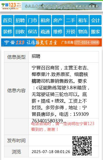 宁晋召召商贸,主营王老吉、椰泰果汁.致养原浆、细磨核桃! 招聘司机兼销售数名。要求:c证能熟练驾驶3.8米箱货,无驾驶证骑三轮也可以。底薪+提成+绩效。工资上不封顶。多劳多得,地址:宁晋县唐邱乡。电话:1593097634015803396484