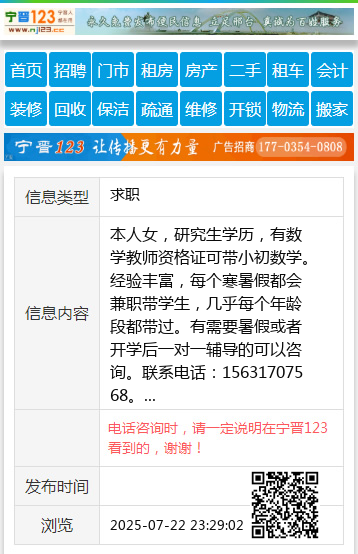本人女,研究生学历,有数学教师资格证可带小初数学。经验丰富,每个寒暑假都会兼职带学生,几乎每个年龄段都带过。有需要暑假或者开学后一对一辅导的可以咨询。联系电话:15631707568。 【电话咨询时,请一定说明在宁晋123看到的,谢谢!】 |