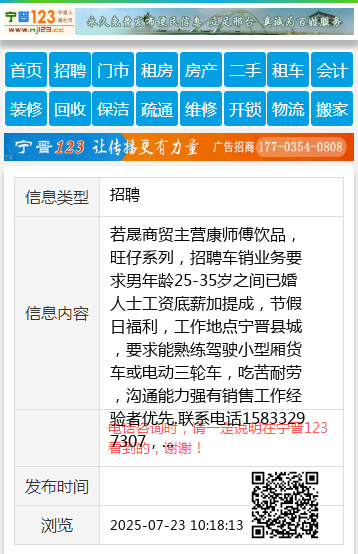 若晟商贸主营康师傅饮品,旺仔系列,招聘车销业务要求男年龄25-35岁之间已婚人士工资底薪加提成,节假日福利,工作地点宁晋县城,要求能熟练驾驶小型厢货车或电动三轮车,吃苦耐劳,沟通能力强有销售工作经验者优先.联系电话15833297307,