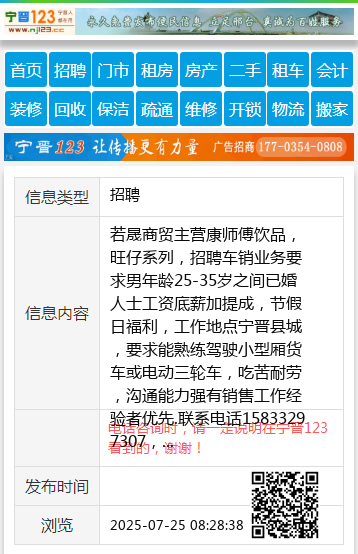 若晟商贸主营康师傅饮品,旺仔系列,招聘车销业务要求男年龄25-35岁之间已婚人士工资底薪加提成,节假日福利,工作地点宁晋县城,要求能熟练驾驶小型厢货车或电动三轮车,吃苦耐劳,沟通能力强有销售工作经验者优先.联系电话15833297307,
