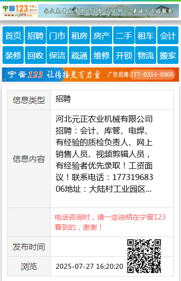 河北元正农业机械有限公司招聘:会计、库管、电焊、有经验的质检负责人、网上销售人员、视频剪辑人员,有经验者优先录取!工资面议!联系电话:17731968306地址:大陆村工业园区 【电话咨询时,请一定说明在宁晋123看到的,谢谢!】 |