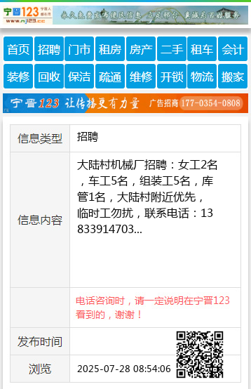 大陆村机械厂招聘:女工2名,车工5名,组装工5名,库管1名,大陆村附近优先,临时工勿扰,联系电话:13833914703 【电话咨询时,请一定说明在宁晋123看到的,谢谢!】 |