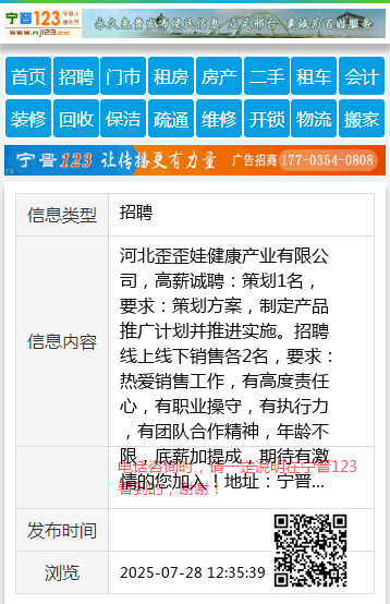 河北歪歪娃健康产业有限公司,高薪诚聘:策划1名,要求:策划方案,制定产品推广计划并推进实施。招聘线上线下销售各2名,要求:热爱销售工作,有高度责任心,有职业操守,有执行力,有团队合作精神,年龄不限,底薪加提成,期待有激情的您加入!地址:宁晋世爵公馆,联系电话:17532378688,0319-5689888 【电话咨询时,请一定说明在宁晋123看到的,谢谢!】 |