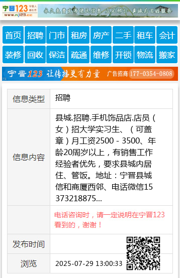 县城.招聘.手机饰品店.店员(女)招大学实习生、(可盖章)月工资2500-3500、年龄20周岁以上,有销售工作经验者优先,要求县城内居住、管饭。地址:宁晋县城信和商厦西邻、电话微信15373218875 【电话咨询时,请一定说明在宁晋123看到的,谢谢!】 |