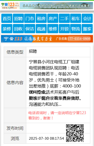 宁晋县小河庄电缆工厂组建电缆销售团队现招聘:电话电缆销售若干,年龄20-40岁,优先男士(可接受外地出差地推)底薪:4000-10000+提成。