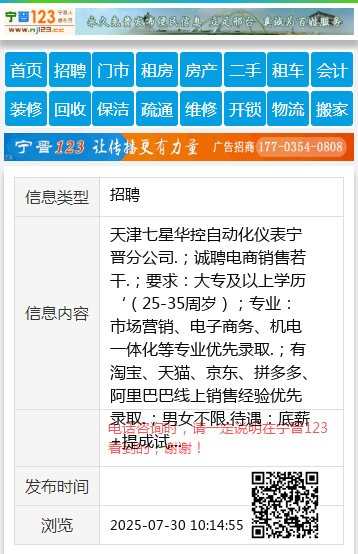 天津七星华控自动化仪表宁晋分公司.;诚聘电商销售若干.;要求:大专及以上学历‘(25-35周岁);专业:市场营销、电子商务、机电一体化等专业优先录取.;有淘宝、天猫、京东、拼多多、阿里巴巴线上销售经验优先录取.;男女不限.待遇:底薪+提成试用期1-3个月.3000/月+提成.要求踏实肯干、有上进心.每天工作八个小时.五险.节假日全休.实行单双休.工作地点:方大科技园.如有想法可以与我们联系.联系电话:13752055332刘经理.17867425860罗经理. 【电话咨询时,请一定说明在宁晋123看到的,谢谢!】 |