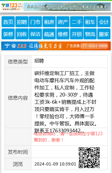 碳纤维定制工厂招工,主做电动车摩托车汽车外观的配件加工,私人定制,工作轻松要求男,20-30岁,待遇工资3k-6k+销售提成上不封顶只要踏实肯干,月入过万!零经验也可,大师傅一手提拔。中午管饭。具体面议。联系王17633093442 【电话咨询时,请一定说明在宁晋123看到的,谢谢!】 |