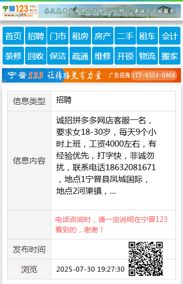 诚招拼多多网店客服一名,要求女18-30岁,每天9个小时上班,工资4000左右,有经验优先,打字快,非诚勿扰,联系电话18632081671,地点1宁晋县凤城国际,地点2河渠镇, 【电话咨询时,请一定说明在宁晋123看到的,谢谢!】 |