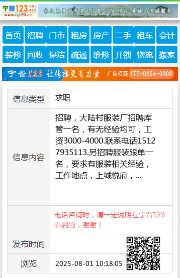 招聘,大陆村服装厂招聘库管一名,有无经验均可,工资3000-4000.联系电话15127935113.另招聘服装跟单一名,要求有服装相关经验,工作地点,上城悦府, 【电话咨询时,请一定说明在宁晋123看到的,谢谢!】 |