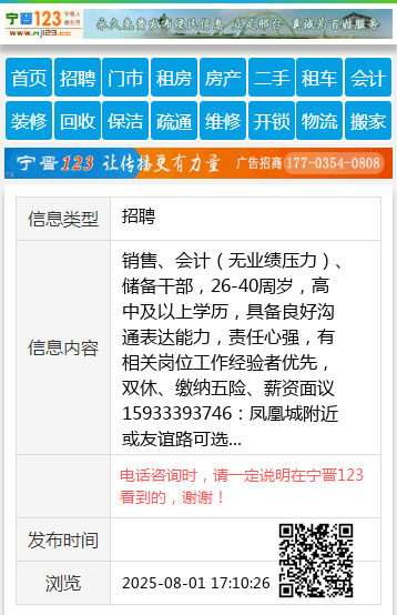 销售、会计(无业绩压力)、储备干部,26-40周岁,高中及以上学历,具备良好沟通表达能力,责任心强,有相关岗位工作经验者优先,双休、缴纳五险、薪资面议15933393746:凤凰城附近或友谊路可选 【电话咨询时,请一定说明在宁晋123看到的,谢谢!】 |