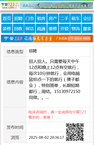 招人招人。只需要每天中午12点和晚上12点有空就行,每次10分钟就行,会用电脑鼠标点一下的就行(傻子都会),特别简单,长期短期都行,周结。15130972150同微。。 【电话咨询时,请一定说明在宁晋123看到的,谢谢!】 |