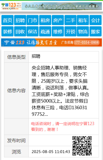 央企招聘人事助理、销售经理,售后服务专员,男女不限,25周岁以上,要求头脑清晰,说话利落,做事认真。工资底薪+奖励+津贴,综合薪资5000以上。法定节假日休息有三险,电话13603197752 【电话咨询时,请一定说明在宁晋123看到的,谢谢!】 |