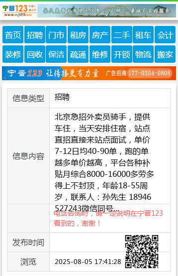 北京急招外卖员骑手,提供车住,当天安排住宿,站点直招直接来站点面试,单价7-12日均40-90单,跑的单越多单价越高,平台各种补贴月综合8000-16000多劳多得上不封顶,年龄18-55周岁,联系人:孙先生 18946527243微信同号 【电话咨询时,请一定说明在宁晋123看到的,谢谢!】 |