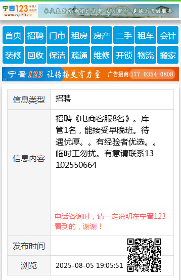 招聘《电商客服8名》。库管1名,能接受早晚班。待遇优厚。。有经验者优选。。临时工勿扰。有意请联系13102550664