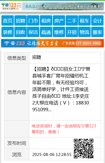 【招聘】🎉招女工✅宁晋县城手套厂常年招缝纫机工年龄不限,有无经验均可,活简单好学,计件工资接送孩子自由🏠地址:1李史庄2大柳庄电话(V):18830951099 【电话咨询时,请一定说明在宁晋123看到的,谢谢!】 |